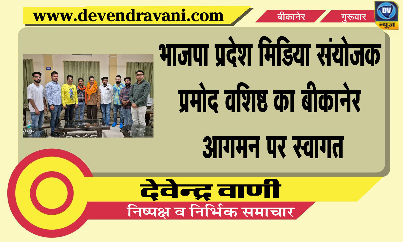 बीकानेर। भारतीय जनता पार्टी प्रदेश मिडिया संयोजक प्रमोद वशिष्ठ एक दिवसीय दौरे पर बीकानेर पहुंचे बीकानेर आगमन पर भाजपा नेताओं ने सर्किट हाऊस में माल्यार्पण कर वशिष्ठ का स्वागत किया।